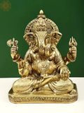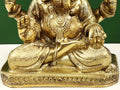 The 9" Brass Lord Ganesha in Abhaya Mudra is a brass statue in the devotional sculpture category. Created as a nine inch figure, it is cast in solid brass and finished by skilled hands to bring out its precise detailing. The piece follows traditional brass casting techniques, with a hand polish that yields a warm luster and a subtle antiqued patina that accentuates the carved jewelry, the crown, and the trunk.