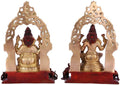 9" Lord Ganesha and Goddeess Lakshmi In Brass | Handmade | Made In India is a brass statue that brings together two revered figures into a single decorative sculpture. This handcrafted piece from Exotic India Art blends spiritual symbolism with the warmth of brass, suitable for display in living spaces or sacred corners.
