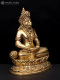 Handcrafted by skilled artisans, the sculpture shows a seated Hanuman on a lotus pedestal with meticulous detailing in the facial features, posture, and drapery. The finish presents a warm, muted patina that highlights the form and textures.