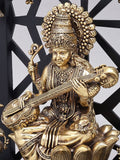 12" Superfine Goddess Saraswati with Peacock Lamps and Bells | Brass Statue with Designer Wood Frame