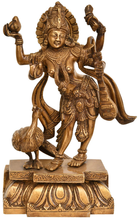 13" Standing Saraswati Brass Idol | Handmade Brass Statue