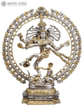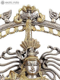 The 20" Lord Shiva as Nataraja Brass Sculpture | Handmade Brass Figurine | Made in India is a brass statue in the classical Nataraja form that blends spiritual symbolism with artisanal craftsmanship. Meticulously cast in brass through traditional lost wax techniques and finished by skilled hands, the figure carries a warm antique patina that highlights fine details of the dancing Shiva. The crown, uplifted leg, drum and the circle of fire are rendered with careful relief on a sturdy base, inviting close inspection of lines and textures. This representation captures the mythic theme of creation, preservation and destruction as a timeless artistic statement. Suitable for a home temple, meditation space, or as a decor accent on a shelf or altar, it also makes a thoughtful gift for collectors of Indian art. Handcrafted by artisans, each piece bears subtle, unique variations that attest to its handmade character as part of the Exotic India Art collection.