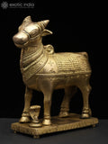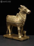 The 6" Small Standing Nandi (Vahana of Lord Shiva) with Shivalinga | Brass Statue is a brass statue that depicts Nandi, the sacred bull and celestial vehicle of Lord Shiva, in a calm, upright stance.