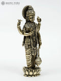Small Four Armed Lord Vishnu Standing on Lotus | Brass Statue | Multiple Sizes is a brass statue that depicts the Hindu preserver god Vishnu in a poised standing posture atop a lotus pedestal.
